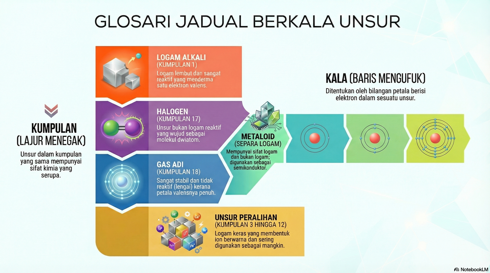 | Kumpulan | Lajur menegak dalam Jadual Berkala Unsur. Kedudukan kumpulan ditentukan oleh bilangan elektron valens. |