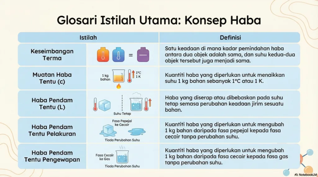 | Haba Pendam Tentu Pengewapan | Kuantiti haba yang diperlukan untuk mengubah 1 kg bahan daripada fasa cecair kepada gas tanpa perubahan suhu. |
