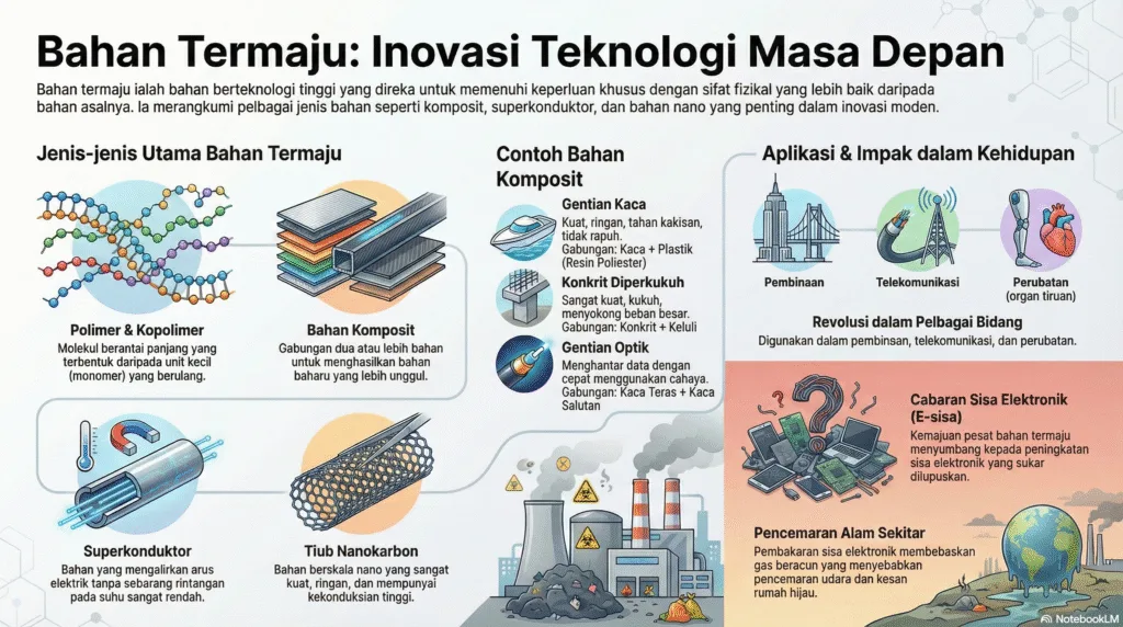 | Bahan Komposit | Bahan yang mengandungi dua atau lebih jenis bahan berbeza yang digabungkan untuk menghasilkan bahan baharu dengan sifat fizikal yang lebih baik. |