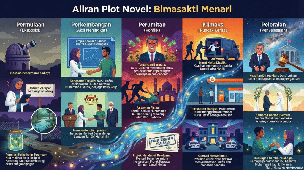 | TEMA Tema novel ini ialah kegigihan anak muda dalam usaha melestarikan alam sekitar. Nurul Hafsa berazam untuk mewujudkan Kawasan Simpan Langit Gelap di Kuala Selangor. Dia mendapat bantuan abangnya, Budiman dan sahabat abangnya, Muhammad Taufik. Namun begitu, perjuangan mereka dihalang oleh Dato’ Johann Arlington-Majid yang merupakan musuh bapa Taufik. Beberapa musibah yang berlaku akhirnya dapat dtatasi oleh mereka sehingga membawa kepada pelaksanaan projek yang dicadangkan oleh Nurul Hafsa. |