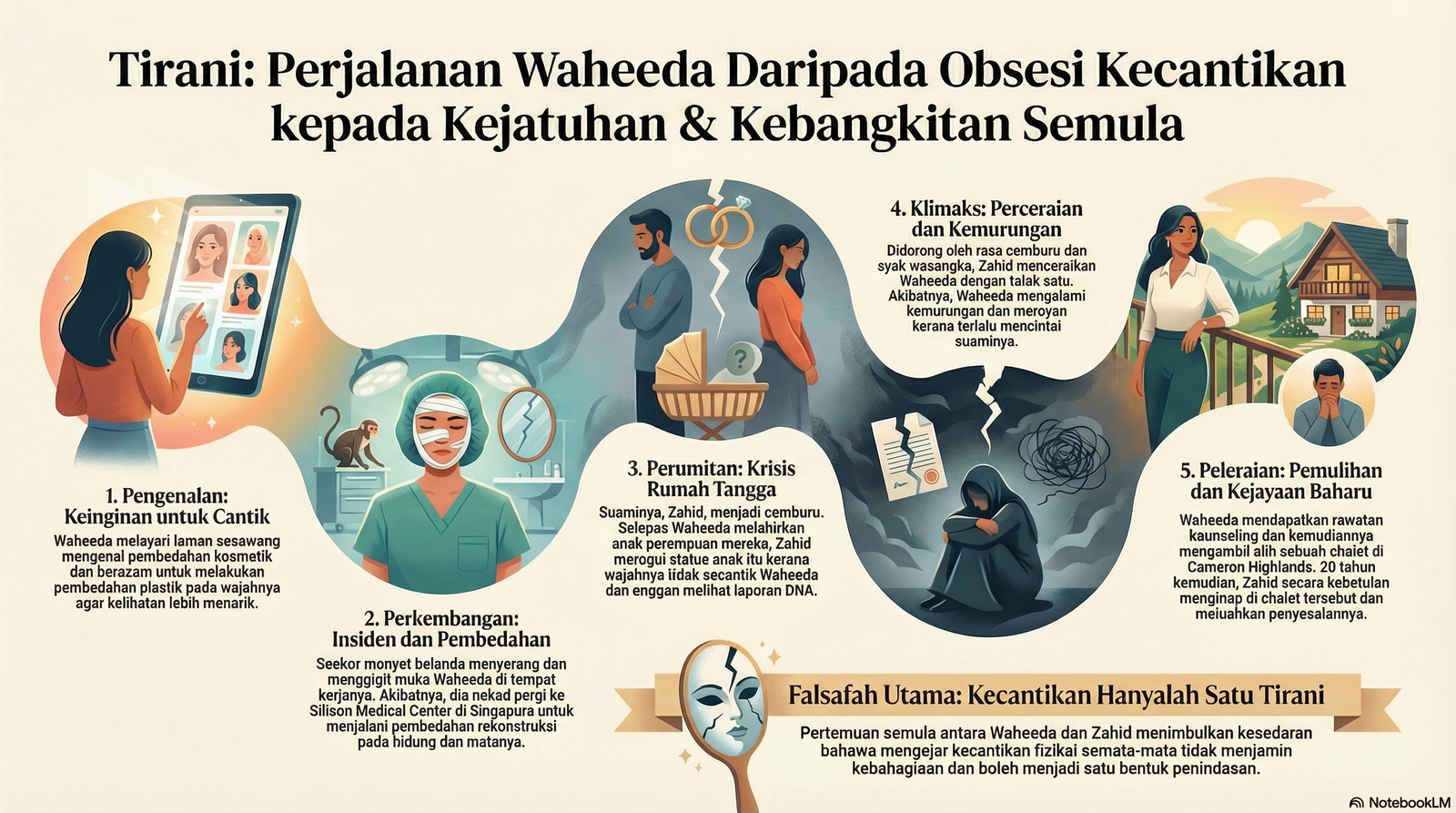| “TIRANI” mengisahkan Waheeda, yang ingin menjadi cantik dan berjaya dalam bidang pelancongan. Setelah menjalani pembedahan rekonstruksi hidung, dia mencapai kecantikan dan kejayaan, namun mengabaikan peranannya sebagai isteri. Suaminya, Zahid, menceraikannya kerana cemburu dan wajah anak mereka yang tidak mewarisi kecantikannya. Waheeda kemudian berjaya mengurus chalet di Cameron Highlands bersama anaknya, Izzati, dan akhirnya dipertemukan semula dengan Zahid. Falsafah hidup yang dipelajari adalah bahawa kecantikan hanyalah satu tirani. |