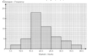 2. Hitung saiz selang kelas dari histogram yang menunjukkan markah ujian Sains.